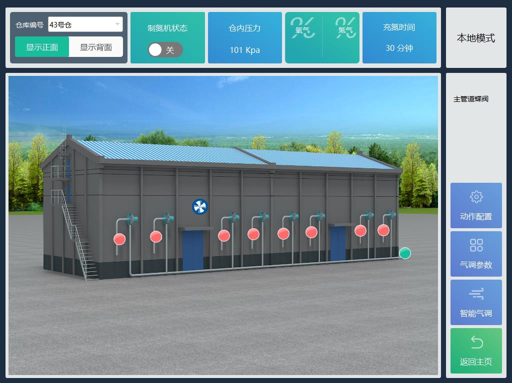 可以配置氣調各個(gè)環(huán)節的參數與動(dòng)作,針對氣調作業(yè)的各個(gè)環(huán)節制定氣調方案 如:充氮、內環(huán)流、強力排空、自然排氣等,并一鍵啟動(dòng)或者關(guān)閉當前方案。